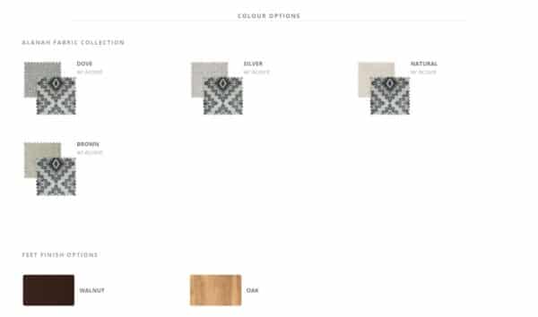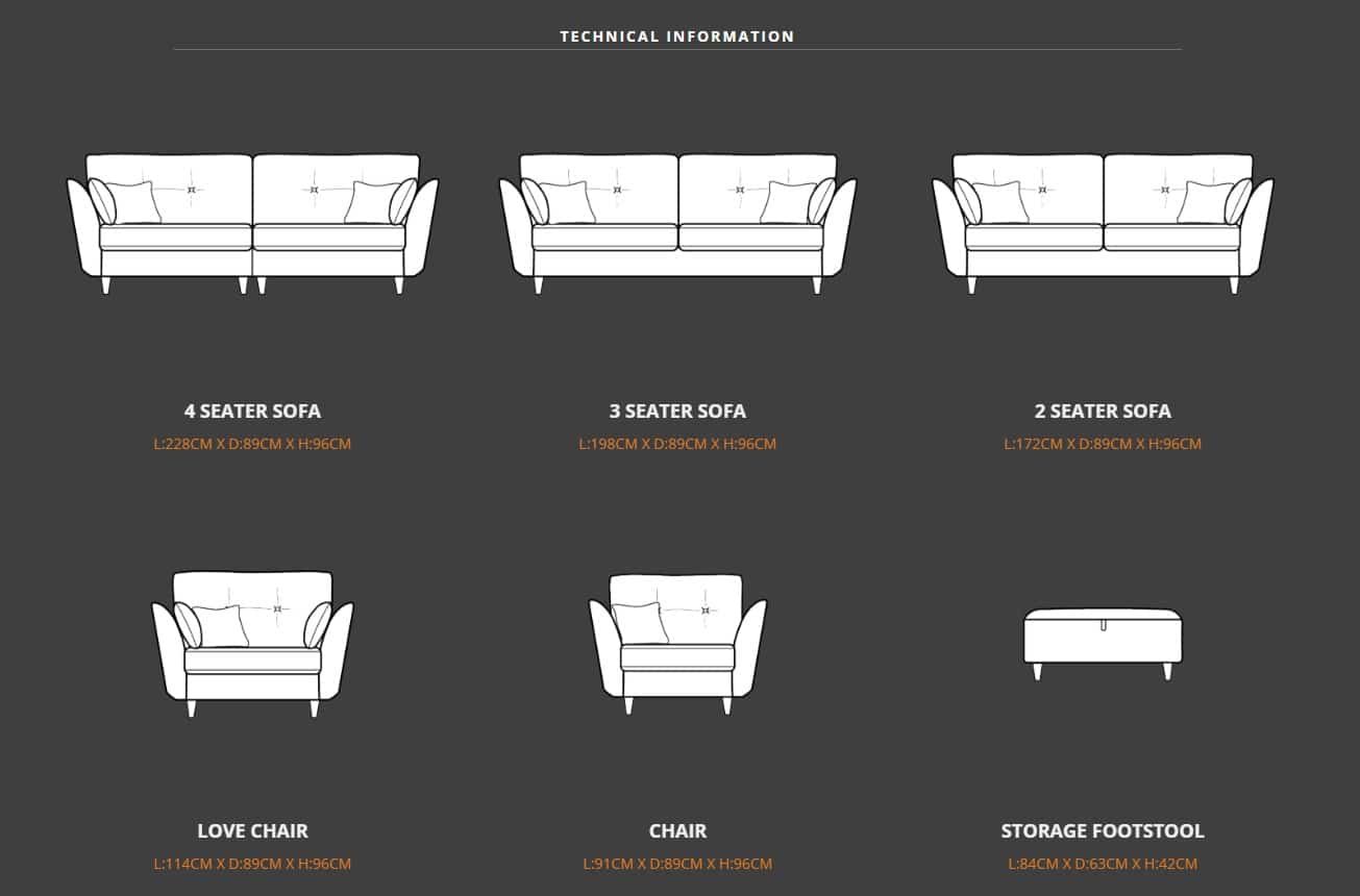 Available as 4 seater, 3 seater, 2 seater, Love chair, single chair and footstool in 4 fabric collections and choice of wooded feet.